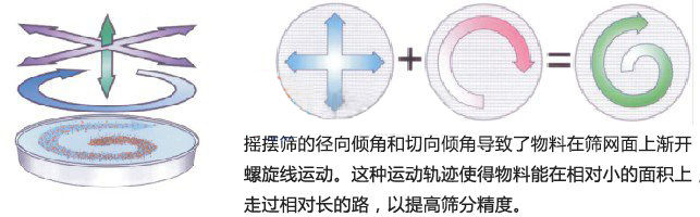 物料在圓形搖擺篩篩面上從中心到外圍擴(kuò)散,物料均勻在篩面上做跳躍旋轉(zhuǎn)的螺旋運(yùn)動(dòng),無(wú)法篩分到下層的物料會(huì)在該層面的出料口排出,直至所有物料篩分完畢。工作任務(wù)結(jié)束。